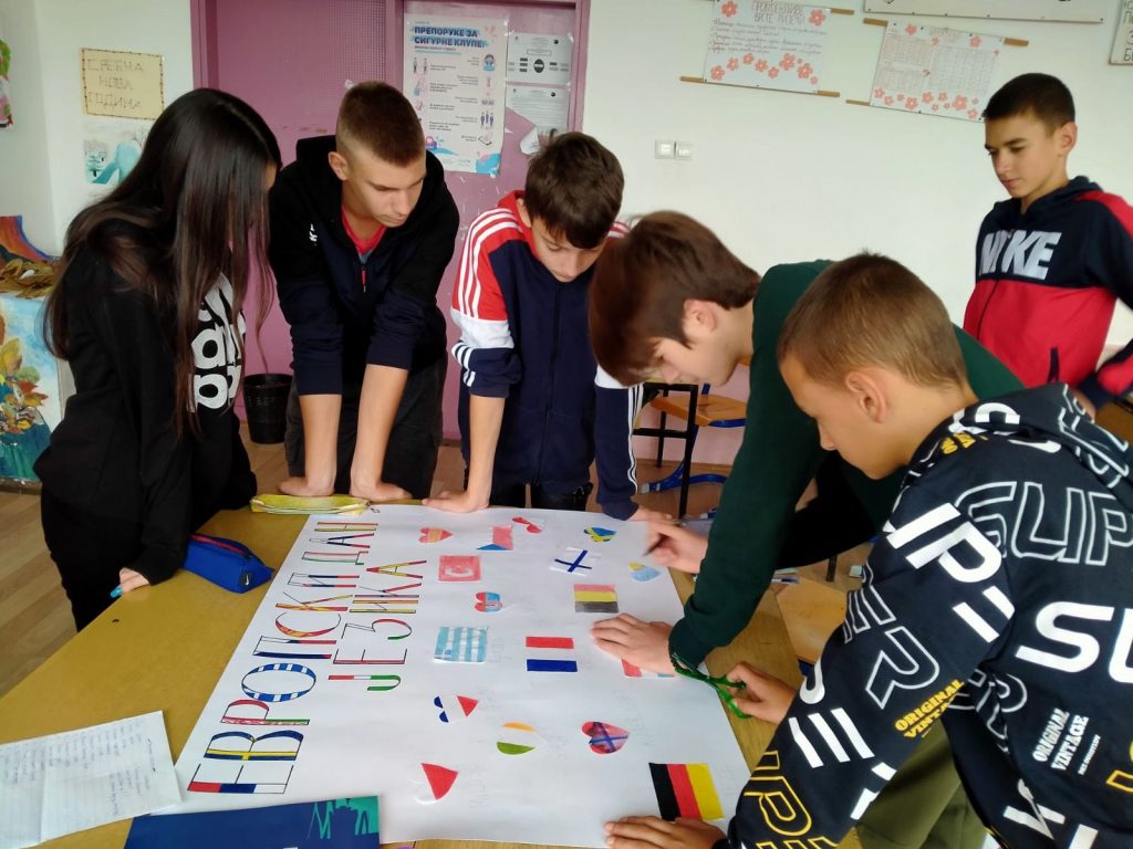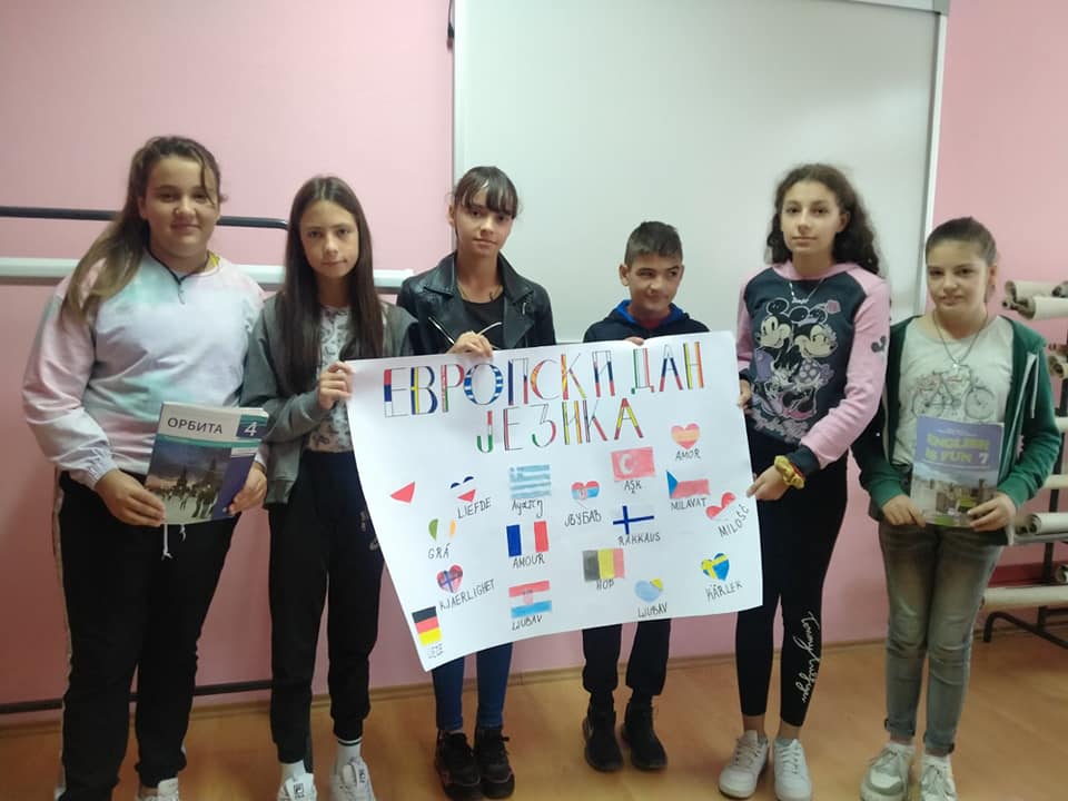 Evropski dan jezika u našoj školi obilježen je u prostorijama biblioteke sa učenicima od šestog do devetog razreda. Pravljen je pano na kome su prikazane zastave evropskih jezika uz poruku „Ljubav na različitim jezicima“. Kroz prezentaciju prikazane su činjenice i zanimljivosti o jezicima, a zatim su učenici učestvovali u kvizu prepoznavanja gradova i država. Na ovaj način predočili smo prednosti učenja i poznavanja različitih jezika.