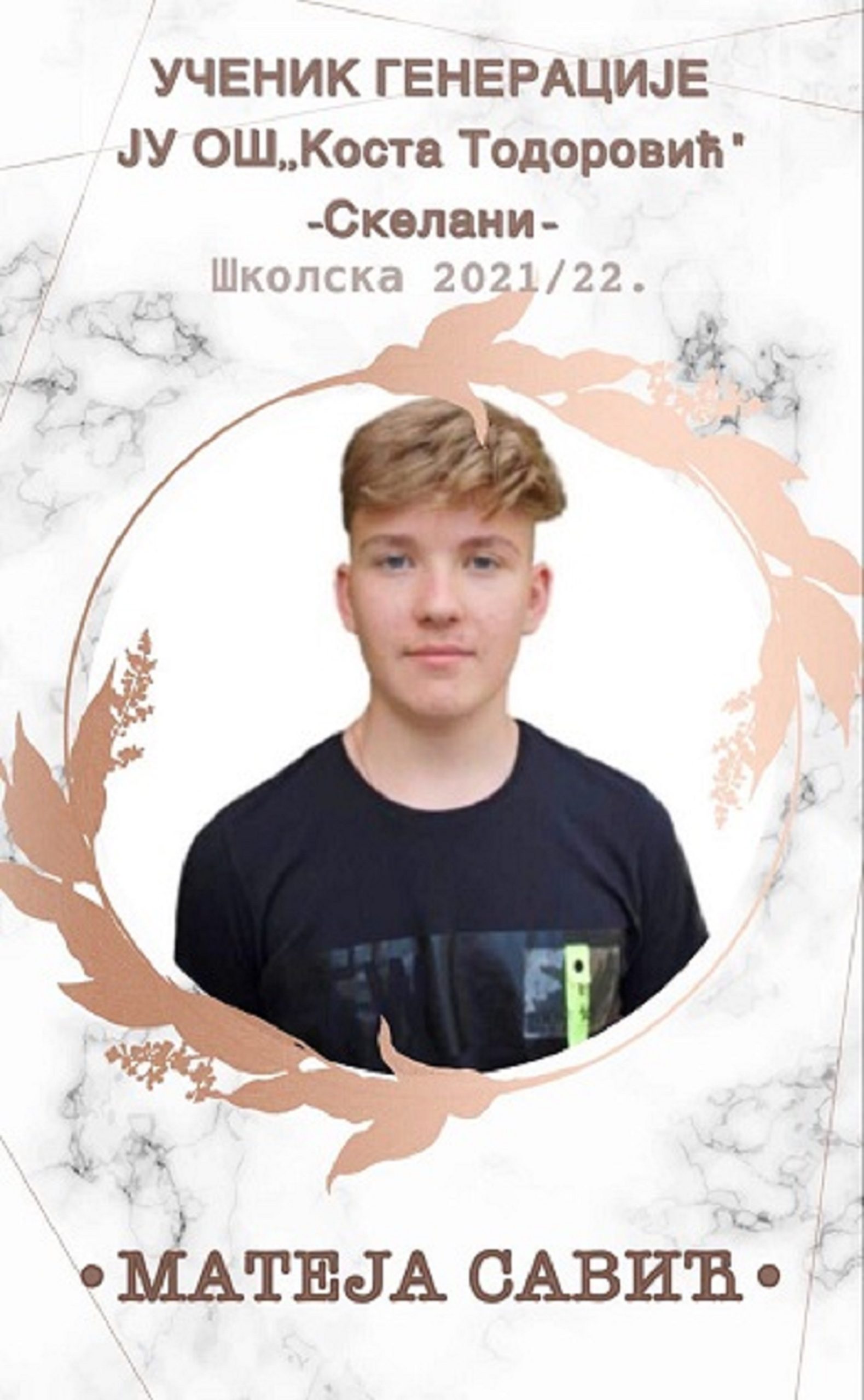 Mateja Savić, dobitnik diplome „Vuk Karadžić“. Učenik koji se istakao izuzetnim uspehom kako na takmičenjima iz nastavnih predmeta tako i u vannastavnim i vanškolskim aktivnostima. Čestitamo Mateja i želimo ti mnogo uspjeha u daljem školovanju.
